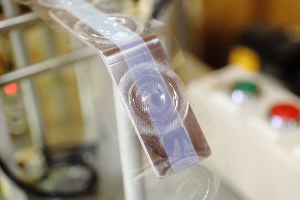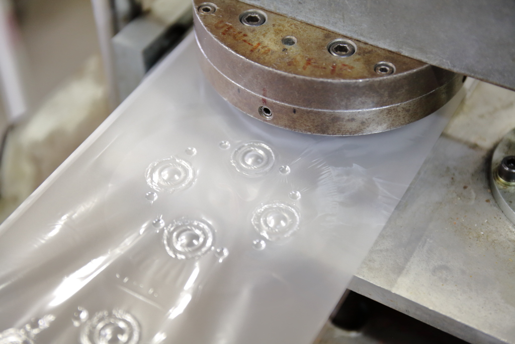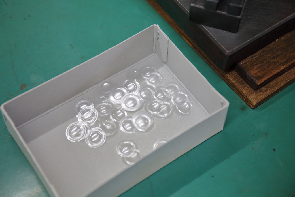 ダイナミックマイクロホンのダイヤフラム(振動板)をミクロン単位のフィルムをプレス形成して制作する様子。フォーリーフは現在2台の機械が稼働しており、そのうちの1台は、テスコ音響研究所の時から使用している年代物で現在も現役で稼働しています。