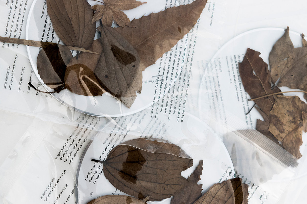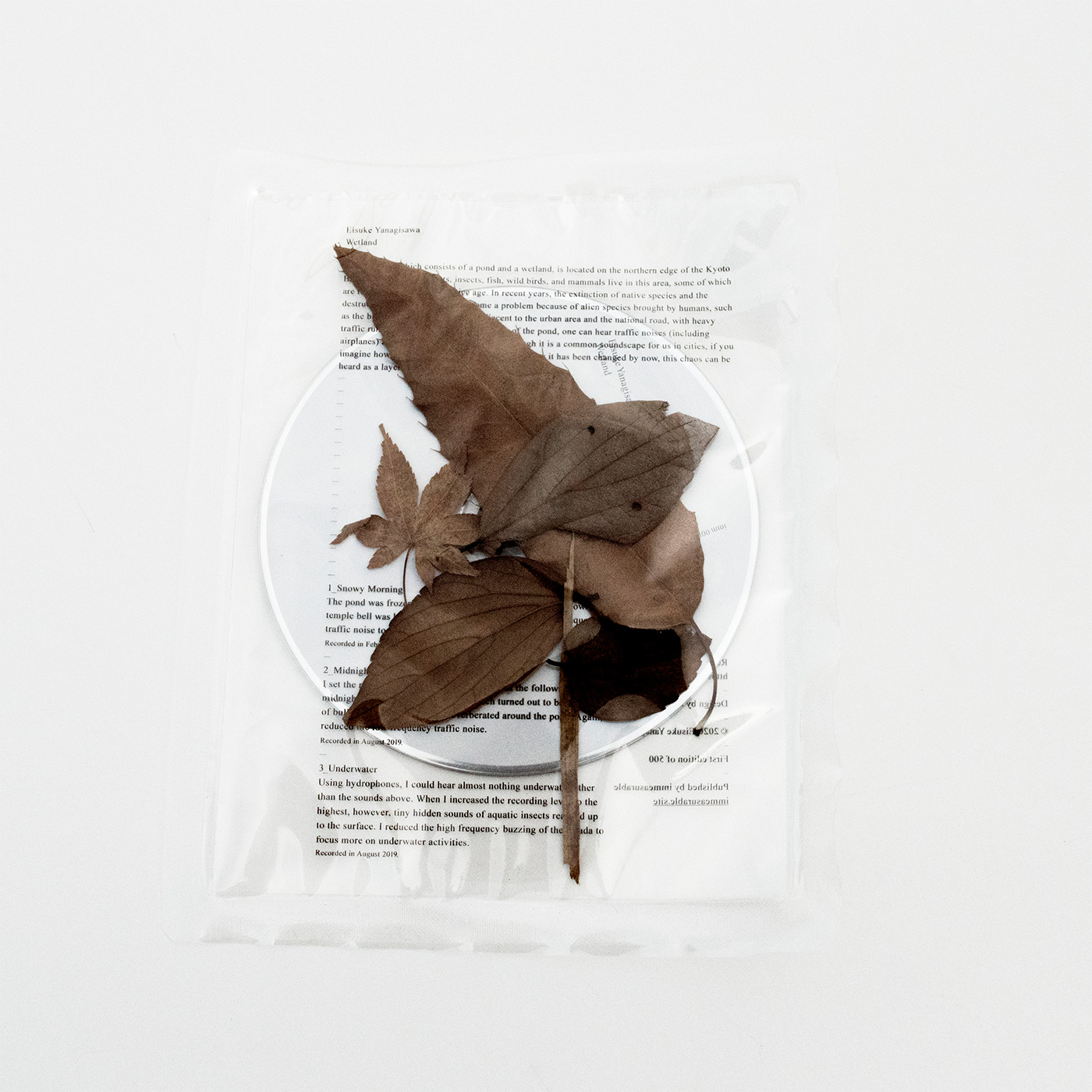 秋山伸 ( edition.nord ) によるパッケージ ( ジャケット )・デザインで録音された池の周囲にて採取された落ち葉などが同封されています。